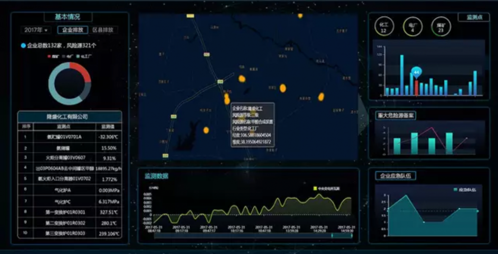 顯示接入的企業(yè)數(shù),設(shè)備數(shù)和監(jiān)測點位數(shù),治污設(shè)備的當前運行狀況和停產(chǎn)限產(chǎn)的異常狀況等信息。